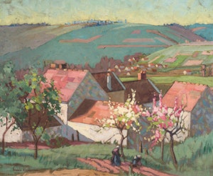 Landscape view over village. Left foreground tree with pink shapes indicating foliage. Midground three rural buildings and a second tree. Background hills and trees, possibly water.