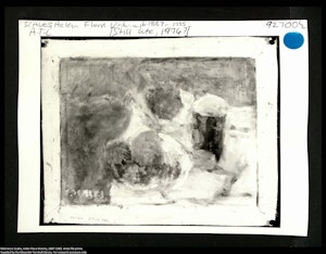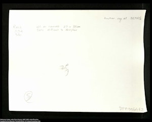 The cards in this file are undated. Correspondence B. de Lange and Kimberley Stephenson, Research Librarian Pictorial, Alexander Turnbull Library, September 2025, notes, “Neither the associated copy negatives nor the file prints are dated but based on notes I found in the negative register one group (intermittent between 1/2-092380-F and 1/2-092705-F) was in existence by May 1979, while a second group (intermittent between 1/2-162480-F to 1/2-162510-F) had been created by December 1986. Given most of the paintings entered the collection in 1979, this does suggest that the first group shows the works soon after they were accessioned. The second group appears to have been taken during reframing or conservation treatment as many are shown without their stretchers.” It is assumed that a card was made for this work at both dates, resulting in two copies noting similar information.