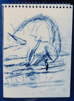 Horizontal bands of green and brown at lower margin. Central group of trees, brown mass of trunks. Umbrella shaped canopy of tree, blue on right and yellow/green on left divided by vertical blue brushstrokes. Area of green middle right margin.