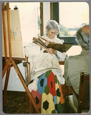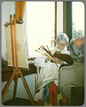 Sitter is Theo de Lange. M. de Lange recorded her observations and photographed the sittings in Scales's room at the Rotorua Masonic Village, 1982. Except from The Notebooks of Marjorie de Lange recording conversations with Flora Scales, 1982-1983, “She said she was tired…but we decided to go ahead and of course as soon as she began it was magical. She is galvanised – sitting with her back to the window, sorting through her box of paints and brushes…beautiful brushes all with their brush heads bound with cotton thread to keep their shape…She is having difficulty finding everything because of reading the labels. Theo is opening her tubes of paint.