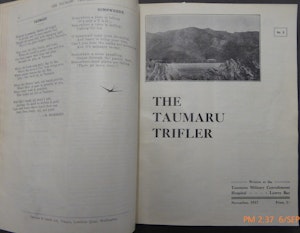 Bound issues of The Taumaru Trifler, March 1917, no. 1 - March 1919, no. 5, were published by Ferguson & Osborn Ltd., Lambton Quay, Wellington, 1917-1919. This copy of the bound volume was donated to the Alexander Turnbull Library, National Library of New Zealand (Reference no. MS2120) by Helen Stewart, artist, who lived in Eastern Bays of Lower Hutt, New Zealand, 1978.