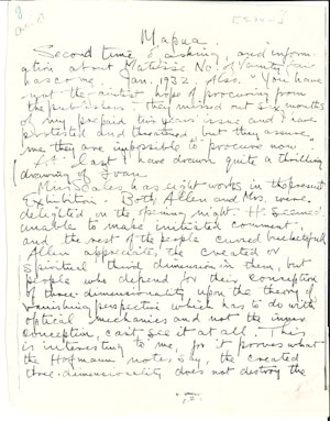 Toss Woollaston correspondence with Rodney Kennedy, headed "Mapua", 1934, held in E.H. McCormick Research Library, Auckland Art Gallery Toi o Tāmaki, New Zealand, ref. file SCALES, H.F.V. (Flora) CORRESPONDENCE 2A, 2 pages, labelled UL g-h [see Related images]: