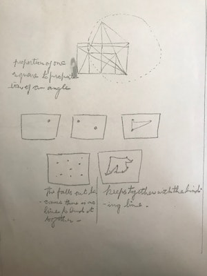Included in Scales’ notes in her boxes and folders: Things swing together in rhythm / a cylinder has one axis / This falls out because there is no line to bind it / Keeps together with the binding line.